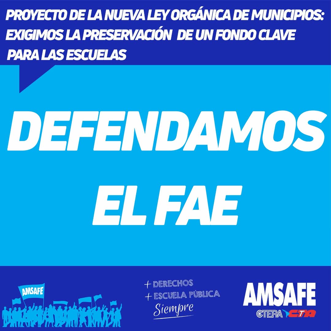 Desde AMSAFE expresamos nuestra profunda preocupación ante el proyecto de nueva Ley Orgánica de Municipios, en el cual no se hace ninguna referencia al Fondo de Asistencia Educativa (FAE). Este fondo ha sido, históricamente, una herramienta fundamental de financiamiento para las escuelas, permitiendo la realización de obras, refacciones y la atención de situaciones concretas que requieren respuestas urgentes.