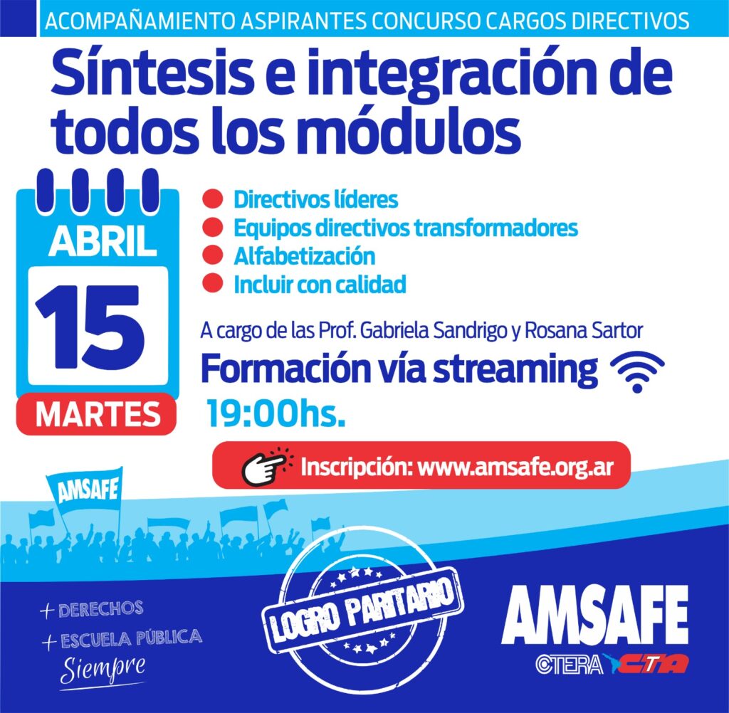 En el marco del Concurso de Ascenso a Cargos Directivos, AMSAFE desarrollará un nuevo encuentro de formación el martes 15 de abril a las 19 horas a través de «AMSAFE Directo» (Streaming por Canal Youtube de AMSAFE).