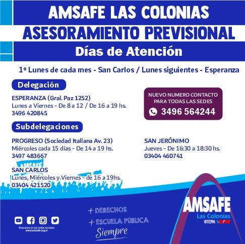 En nombre de toda la comisión de Amsafe Las Colonias queremos agradecer todo el trabajo y la dedicación que ha llevado adelante la Sra Miriam Vega quien venía realizando los trámites hasta el momento y por motivos particulares no puede continuar.