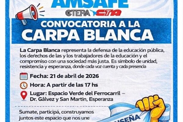📢 Instalamos la Carpa Blanca en el Departamento Las Colonias Un espacio que representa la lucha, la memoria y la defensa de la escuela pública ✊📚 📍 Martes 21 de abrilEsperanza – Espacio Verde del Ferrocarril(Dr. Gálvez y San Martín) 📍 Miércoles 22 de abrilSan Carlos Centro – Plaza La Hermandad(Belgrano y San Lorenzo) ⏰…