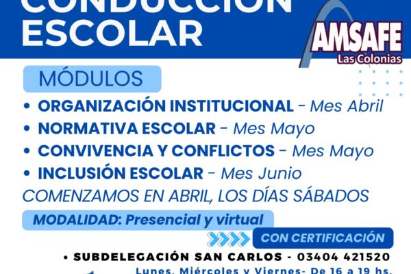 📚✨ Capacitación para afiliados | AMSAFE Las Colonias Te invitamos a participar de la capacitación “Desafíos de la conducción escolar”, junto al Instituto Superior N° 68, con propuestas pensadas para fortalecer la tarea docente y la gestión institucional. 🔹 Módulos: • Organización Institucional (abril) • Normativa Escolar (mayo) • Convivencia y Conflictos (mayo) • Inclusión…