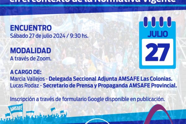 Taller virtual «La función directiva en el contexto de la Normativa vigente» En el marco del Concurso de Ascenso Amsafe Las Colonias el día Sábado 27 Julio dió comienzo con el Talleres virtual «La función directiva en el contexto de la Normativa vigente» a cargo de Lucas Rodaz, Claudia Medina y Marcia Vallejos, con una…