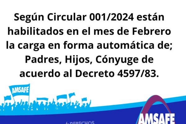 Familiares a cargo A raíz de algunas consultas sobre la carga de Familiar a cargo según Circular 001/2024 están habilitados en el mes de Febrero la carga en forma automática de: Padres, Hijos, Cónyuge de acuerdo al Decreto 4597/83. Para sumar Otros familiares deberán realizar un procedimiento Judicial llamado Curatela que certifica la tenencia, guarda…