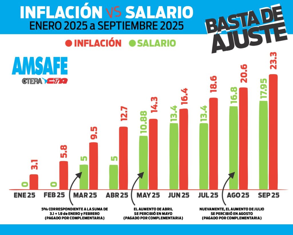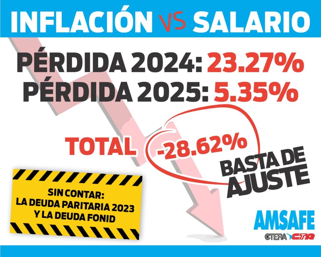 Durante la gestión actual, las y los docentes perdimos un tercio de nuestro poder adquisitivo. Los datos oficiales del IPEC lo confirman: los precios subieron más de 140 %, mientras los aumentos salariales quedaron muy por detrás. A eso se suma la eliminación del FONID y el desconocimiento de la deuda paritaria. Todo esto es aún más grave para las y los jubilados que perciben los aumentos a los 60 días y sufren el descuento de un “aporte solidario” que en realidad es obligatorio. Basta de imposiciones, exigimos reapertura de paritarias ¡YA! No hay educación pública posible sin salarios dignos y sin respeto a los derechos de los trabajadores de la educación.