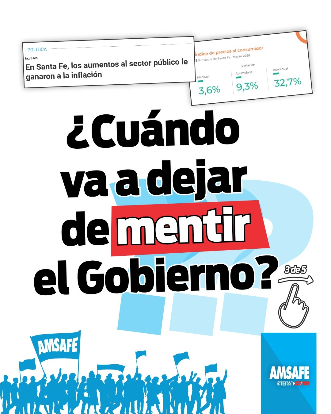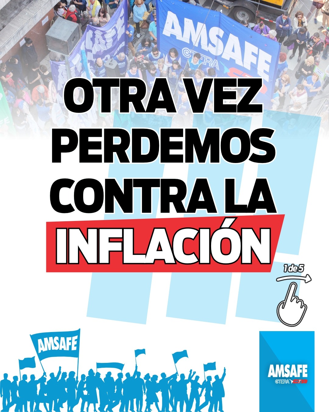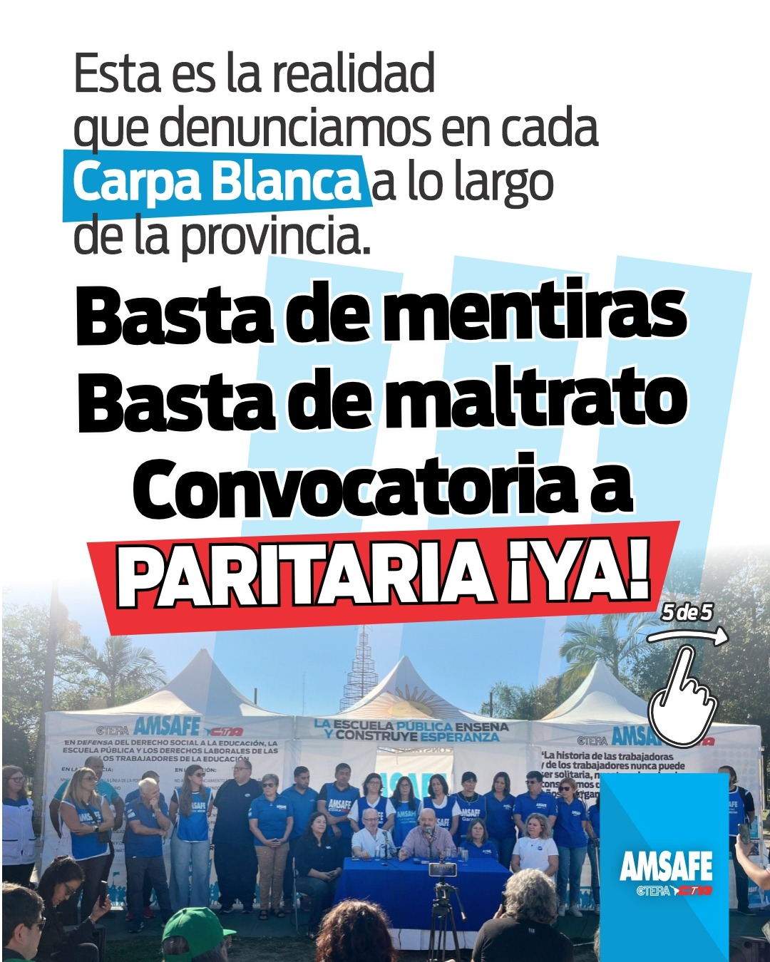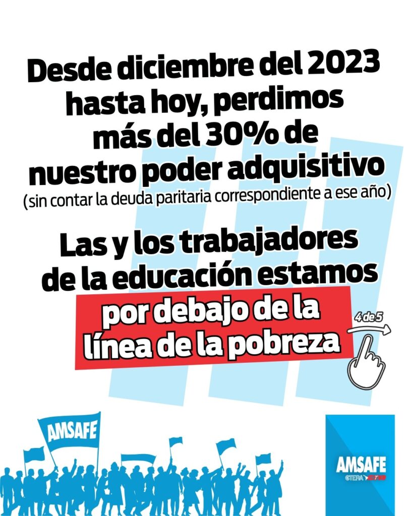 Desde AMSAFE advertimos que el aumento salarial otorgado en marzo vuelve a ubicarse por debajo de la inflación registrada en la provincia de Santa Fe, profundizando la pérdida del poder adquisitivo de las y los trabajadores de la educación. Esta situación se inscribe en un proceso sostenido de deterioro salarial, acompañado por decisiones que afectan las condiciones de trabajo y los procesos de enseñanza y aprendizaje. Frente a este escenario, en la provincia estamos sosteniendo la carpa blanca como espacio de organización y visibilización junto a la comunidad educativa. Exigimos la inmediata convocatoria a paritaria y respuestas concretas que incluyan la recuperación del salario, el pago de la deuda pendiente, la realización de concursos y traslados, y la revisión de las medidas que lesionan los derechos de las y los docentes.
