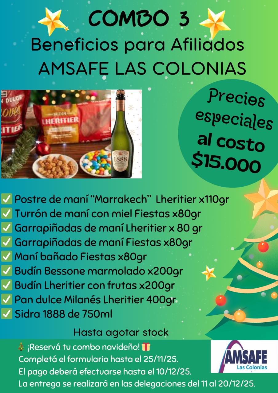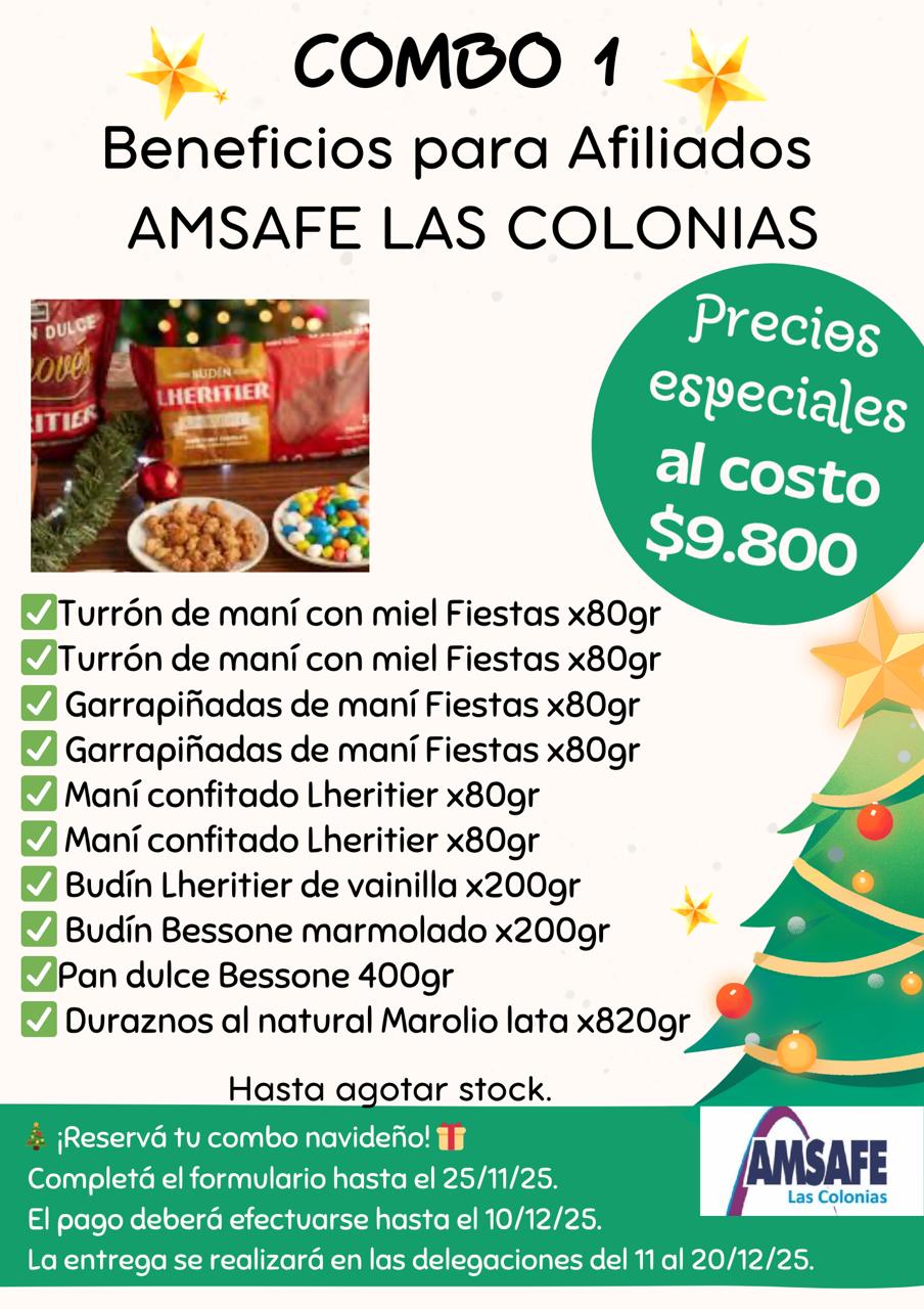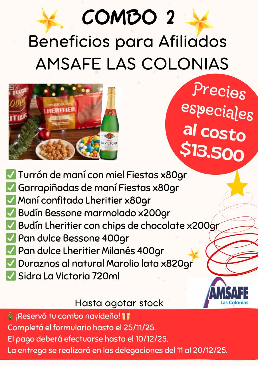 Desde Amsafe Las Colonias ofrecemos 3 combos navideños a MUY BAJO COSTO para afiliados . Deberán completar un formulario para reservar el que desean. Luego se realiza la transferencia al CBU que aparece en el formulario. Por último se retira en la delegación o subdelegaciones más cercanas. Dicha propuesta es hasta terminar Stock. Reserva el tuyo antes que se agoten!