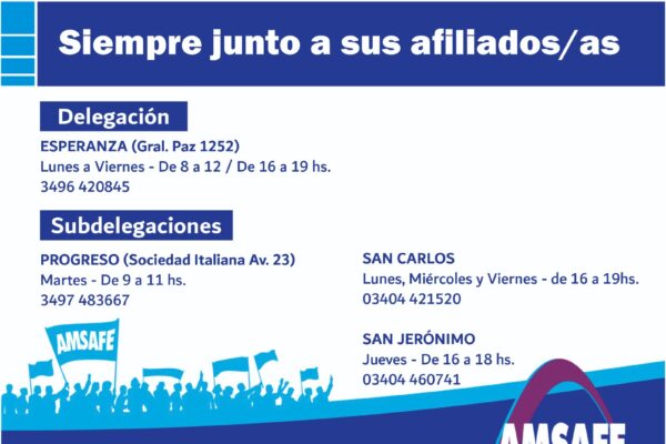 AMSAFE Las Colonias continúa con las gestiones para sumar voluntades. Apelamos a los Delegados/as que quieran consultar a las librerías de sus localidades y transmitirnos, para continuar con las gestiones y asegurarnos llegar a todo el Departamento.
