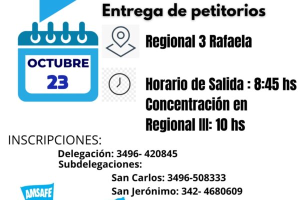 Desde Amsafe Las Colonias les solicitamos puedan enviar a la Delegación y/o Subdelegaciones los petitorios firmados exigiendo la inscripción a traslados y concursos, la presentación en la delegación Regional de Educación III se va a realizar por las delegaciones Castellanos y Las Colonias junto al secretario general de Amsafe, Rodrigo Alonso, el próximo miércoles 23…