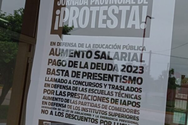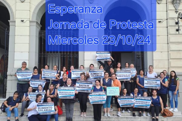 Anoche un grupo de docentes se hizo presente espontáneamente en el Arco de la Colonización de Esperanza dónde asistió el Gobernador. Los docentes hicieron visible los diferentes reclamos que nos preocupan con cartelerías.