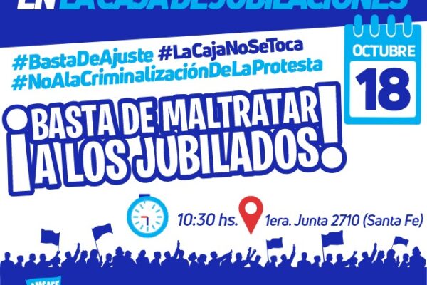 Nos concentramos a las 10:30 hrs frente a la caja de jubilaciones ubicada entre San Jerónimo y Primera Junta de la ciudad de Santa Fe. Los interesados en acompañar delegados, afiliados y jubilados tienen que ANOTARSE en la delegación o subdelegaciones correspondientes. Recuerden que dependemos de su compromiso y responsabilidad con respecto a los lugares….