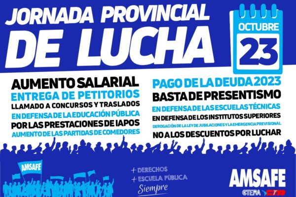 Este 23/10 en el marco de la Resolución de la Asamblea Provincial de AMSAFE, que definió rechazar la propuesta paritaria y realizar jornadas de protesta, se presentará en las distintas delegaciones regionales de educación un petitorio por Concursos de Titularización y Traslados, con las miles de firmas reunidas por AMSAFE. Exigimos tras el rechazo votado…