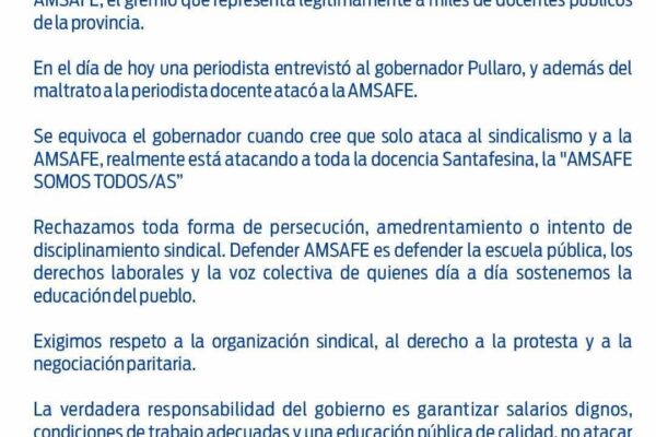 Con motivo de los dichos del gobernador a una docente/ periodista y atacando a nuestro sindicato desde Amsafe Obligado emiten este comunicado en repudio a lo expresado en el día de hoy