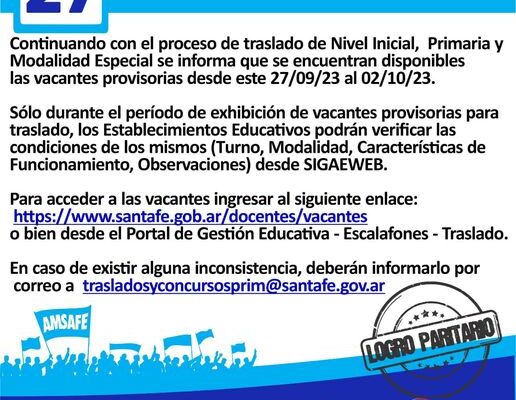 Desde AMSAFE, fruto de la paritaria y la lucha colectiva de toda la docencia santafesina para conquistar más derechos, informamos el cronograma correspondiente a carrera docente de los diferentes niveles y modalidades: TRASLADO IPE:1ra. Etapa inscripción 01/09 al 11/092da. Etapa selección de vacantes 04/10 al 10/10 Suplencias y titularización IPE (Descargar Res 1110-23):1ra. Etapa inscripción a…