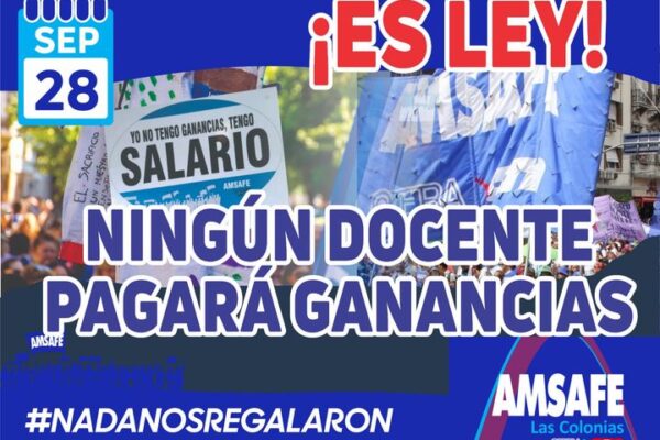 ES LEY: NINGÚN DOCENTE PAGARÁ GANANCIAS Este jueves 28 de septiembre el Senado nacional sancionó la eliminación de la cuarta categoría asegurando, así, que ninguna trabajadora ni ningún trabajador, volverá a pagar el impuesto a las Ganancias. Esta modificación, que regirá a partir del año 2024, eleva el piso del Mínimo No Imponible a casi 2.000.000…