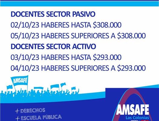 CRONOGRAMA DE PAGO DE HABERES SECTOR DOCENTE PASIVO 02/10/23 HABERES HASTA $308.000 05/10/23 HABERES SUPERIORES A $308.000 SECTOR DOCENTE ACTIVO 03/10/23 HABERES HASTA $293.000 04/10/23 HABERES SUPERIORES A $293.000