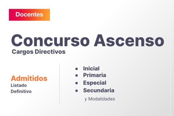 Listado Definitivos de Admitidos Concurso de Ascenso a cargos directivos: IPE, Secundaria y sus respectivas modalidades Ponemos a disposición el listado definitivo de admitidos. Ingresar en este link.