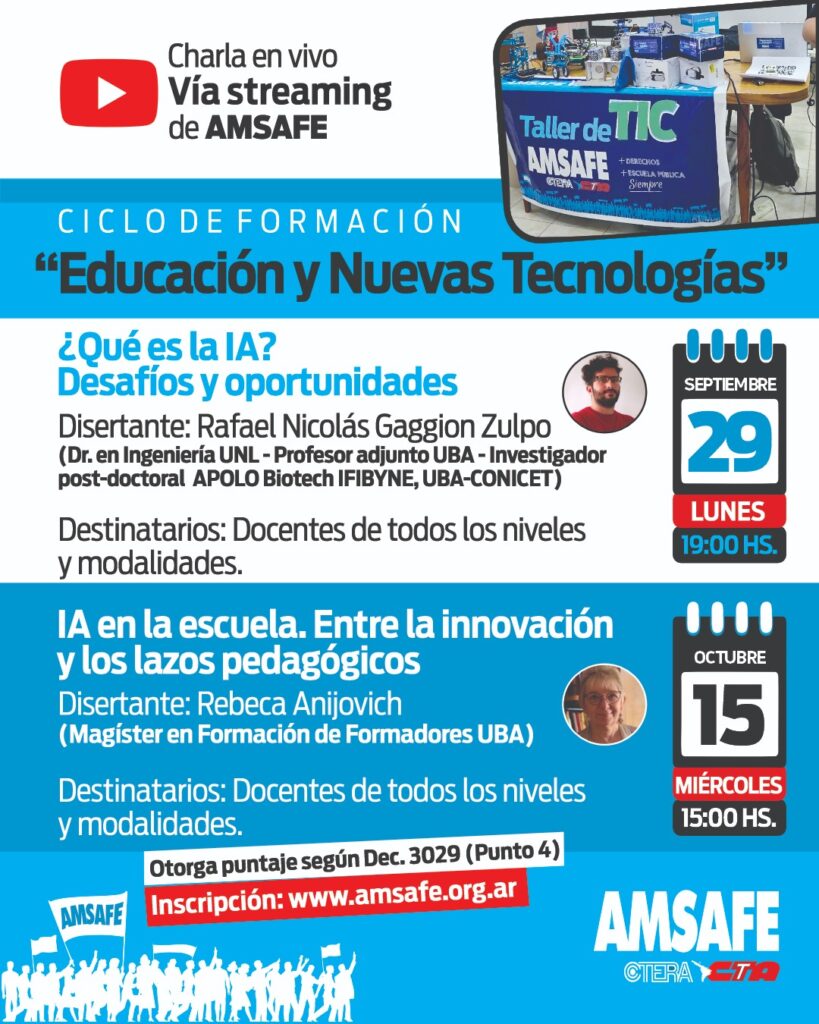 Desde AMSAFE invitamos a la formación en torno a los desafíos que plantea la irrupción de la Inteligencia Artificial en la vida cotidiana y en la escuela.