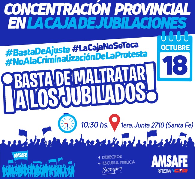 Nos concentramos a las 10:30 hrs frente a la caja de jubilaciones ubicada entre San Jerónimo y Primera Junta de la ciudad de Santa Fe. Los interesados en acompañar delegados, afiliados y jubilados tienen que ANOTARSE en la delegación o subdelegaciones correspondientes. Recuerden que dependemos de su compromiso y responsabilidad con respecto a los lugares. Mañana los esperamos a todos!
