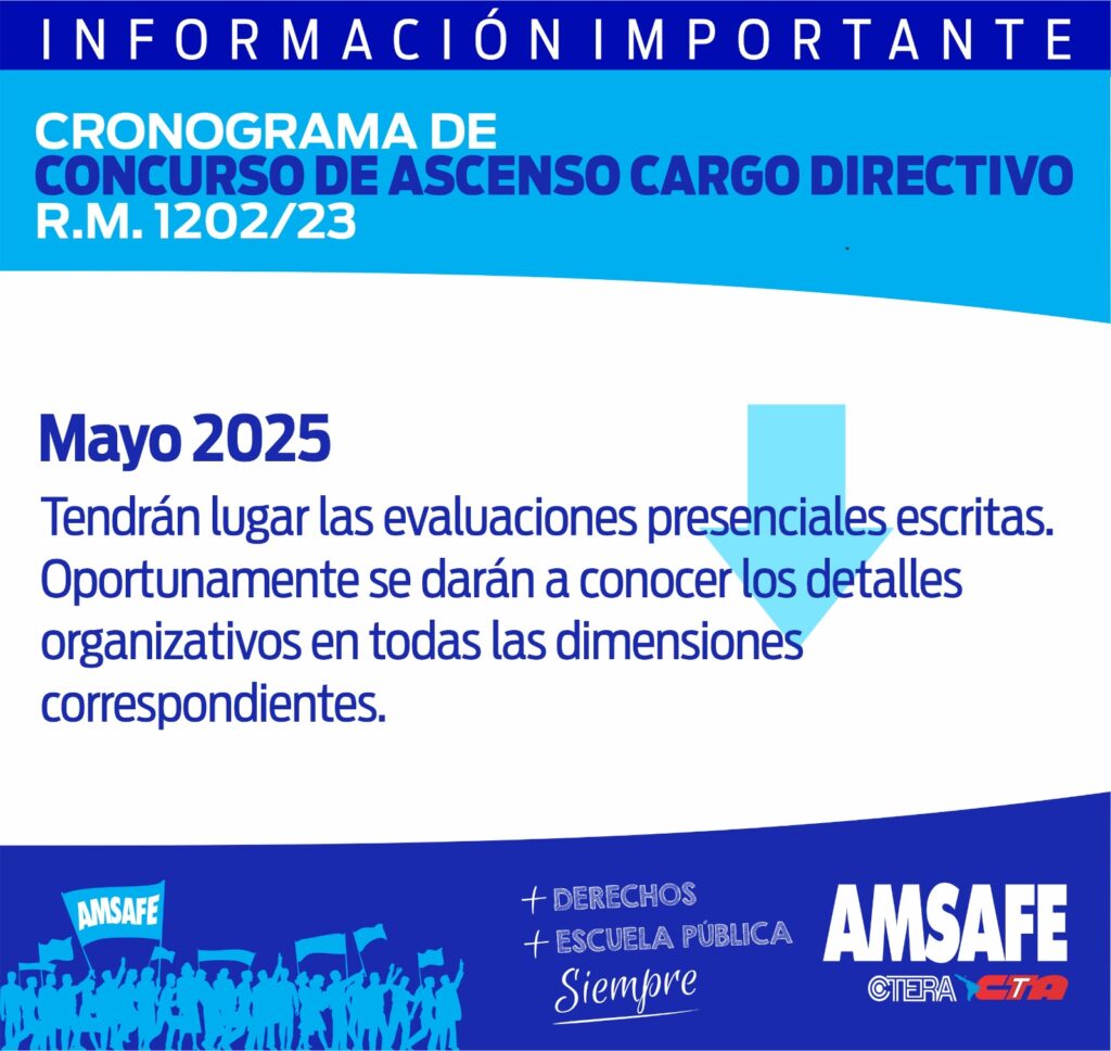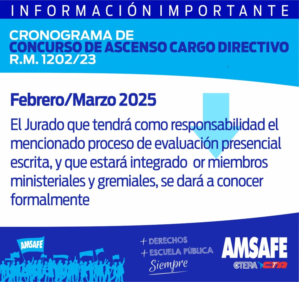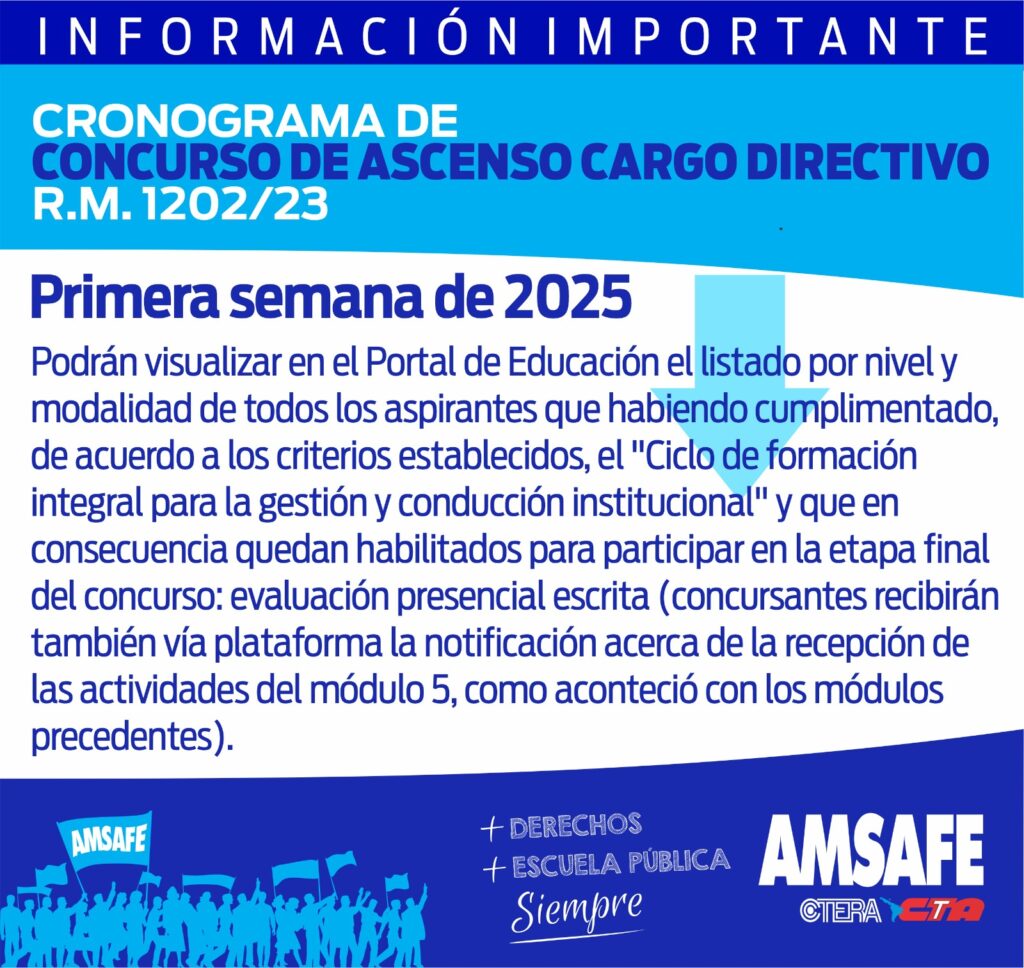 El Ministerio de Educación informó las etapas que forman parte del cronograma del “Concurso de Ascenso cargo directivo” R.M. 1202/23 con sus modificatorias y que continuarán en el año 2025.