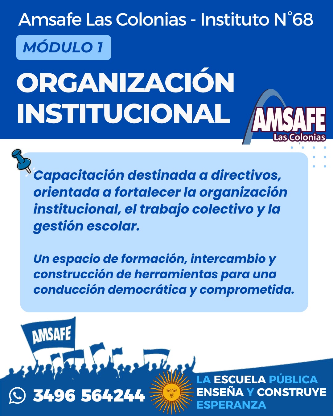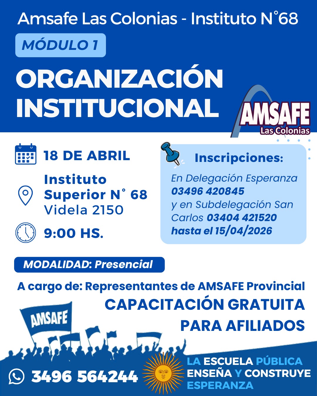El sábado 18 de abril comenzamos un nuevo trayecto de formación qué tiene que ver con inquietudes y temas de interés a partir de la gestión de los nuevos directores. Esta formación cuenta con 4 módulos ( 2 presenciales y 2 virtuales) los dias sábados con un encuentro por mes a partir de abril. Los encuentros presenciales se llevarán adelante en Esperanza y en San Carlos ( solamente uno en cada lugar). Al finalizar se entregarán los certificados previa evaluación. Pueden comenzar a inscribirse para dar inicio el sábado 18 de abril por la mañana en el instituto 68 de Esperanza. Qué tengan una linda jornada!