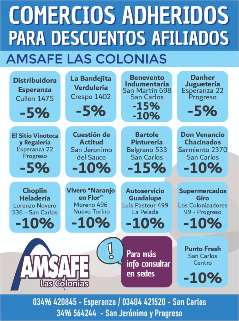 Desde Amsafe Las Colonias compartimos los nuevos Convenios realizados con comercios del departamento. Esta vez Ampliamos rubros y la idea es seguir sumando todos los que se puedan. Recuerden que los comerciantes tienen sus requisitos. Preguntar antes de comprar.
