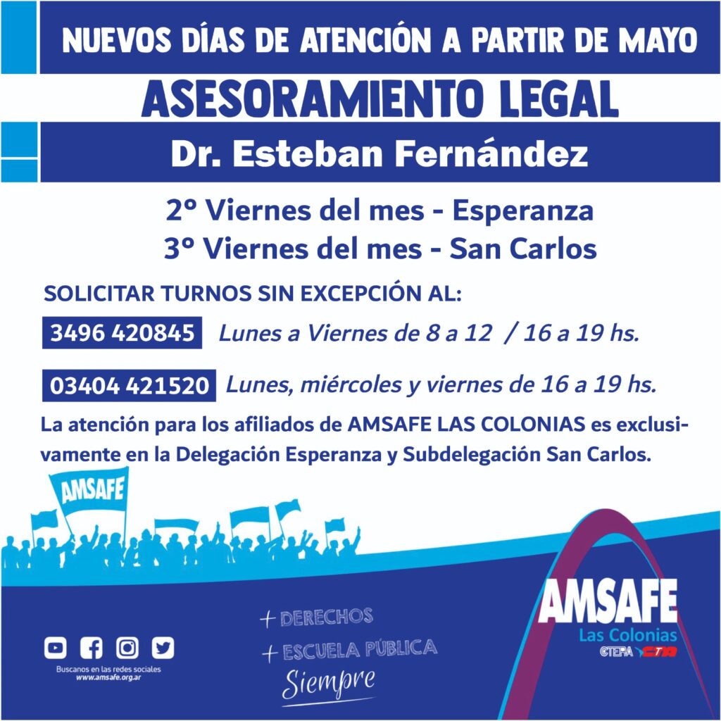 Les dejamos los nuevos días y horarios a partir del Mes de Mayo sobre: ⚠️Asesoramiento Legal Con el Dr Esteban Fernández.