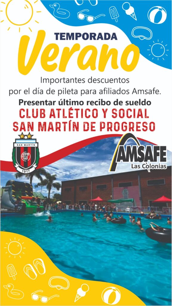 Desde el sindicato se estuvo gestionando con distintos clubes para el uso de piletas, hasta el momento se pudo concretar con algunos de ellos. En esta oportunidad agradecemos a los Clubes Atlético Sarmiento de Humboldt, Club Atlético y Social San Martín de Progreso y Almagro de Esperanza que generosamente han accedido a realizar descuentos por el día de pileta, a los afiliados de AMSAFE. Continuamos las gestiones para sumar voluntades con aquellos Clubes predispuestos para tal fin.
