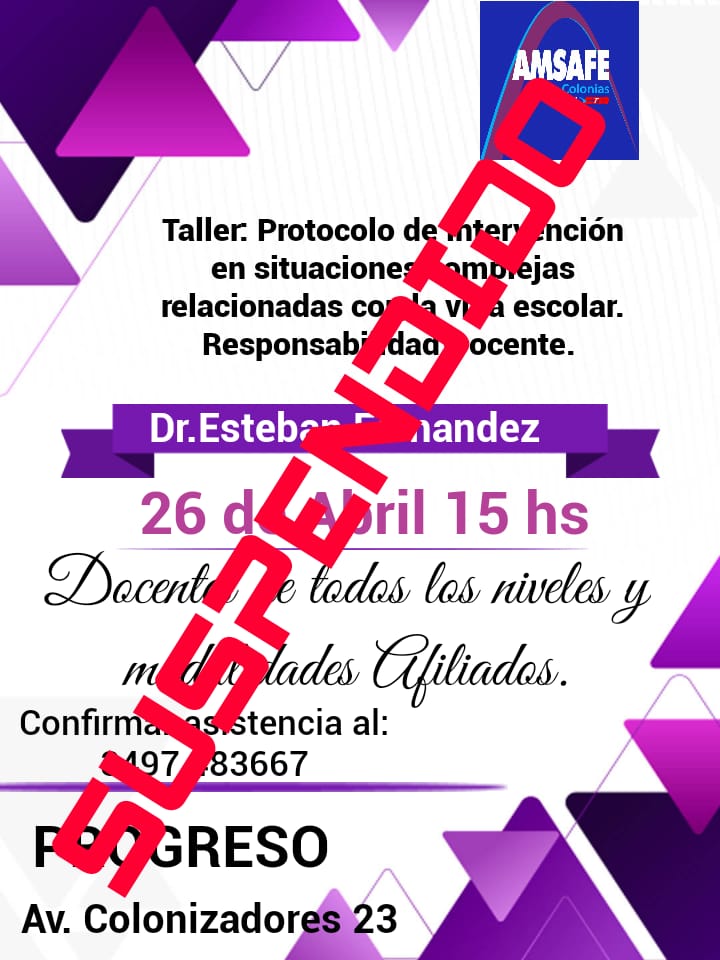 Lamentamos postergar dicho Taller con el Dr. Esteban Fernández en la localidad de Progreso, por contar con muy pocos inscriptos y además por estar sujetos a los tiempos Paritarios y posteriores Asambleas (Departamental y Provincial). Nos hubiese encantado que puedan aprovechar la propuesta de capacitación ya que la temática fue demandada desde las escuelas de la zona.