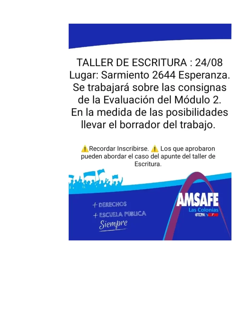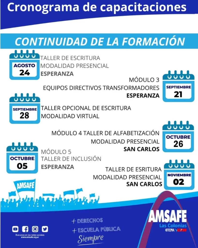 El Taller de Escritura del día Sábado 24/08 9:30hs se realizará en la Escuela Normal: Sarmiento 2644 de Esperanza. Además les compartimos el cronograma de capacitación para el Concurso de Ascenso a cargos Directivos con las nuevas fechas. Solicitamos estén atentos a las publicaciones en nuestras redes y/o Página.